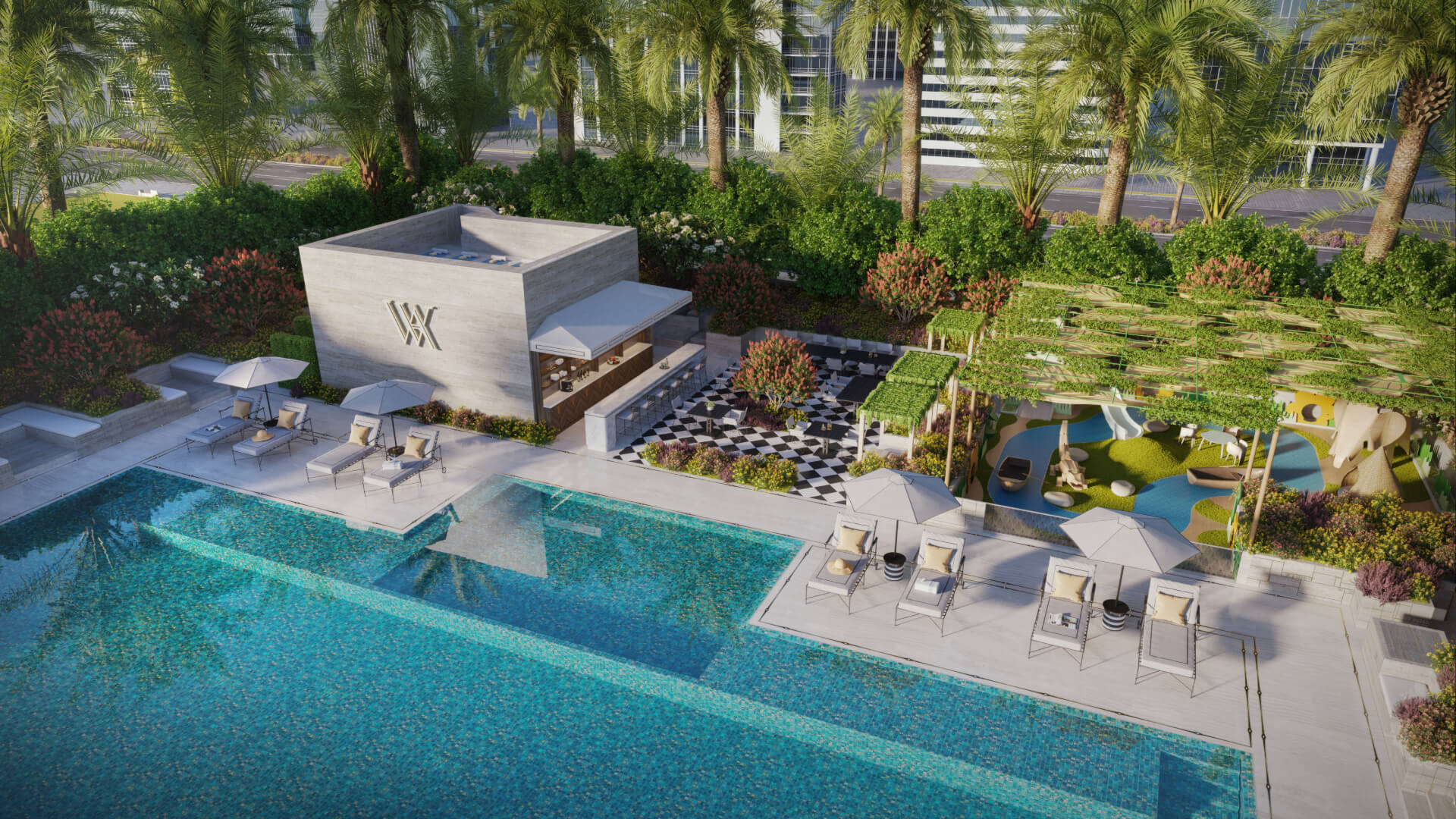 The chic black-and-white Deco-inspired fabric on cabanas, canopies, and poolside furniture captures the brand’s signature glamour. Additional amenities include a private juice bar, barbecue space, and play areas.